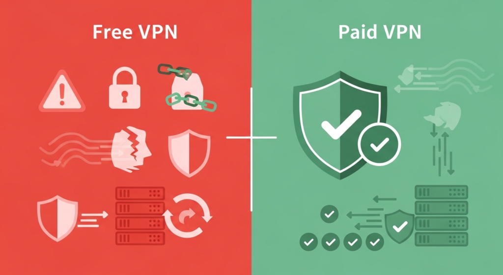 Більшість безкоштовних сервісів заробляють на продажу ваших даних рекламодавцям. Деякі зберігають логи активності. Швидкість зазвичай обмежена — 10 Мбіт/с або менше. Ліміт трафіку — від 500 МБ до 10 ГБ на місяць.